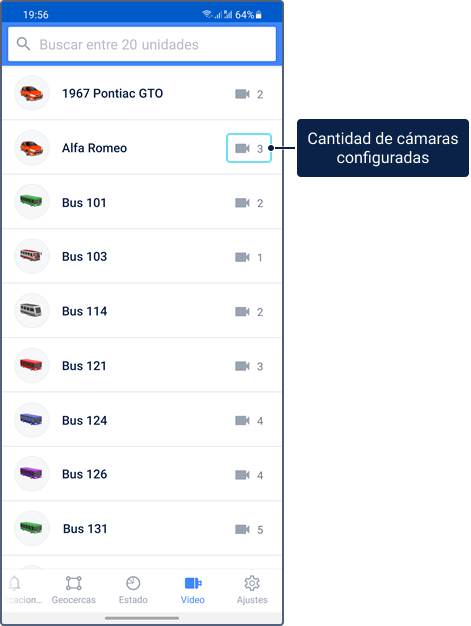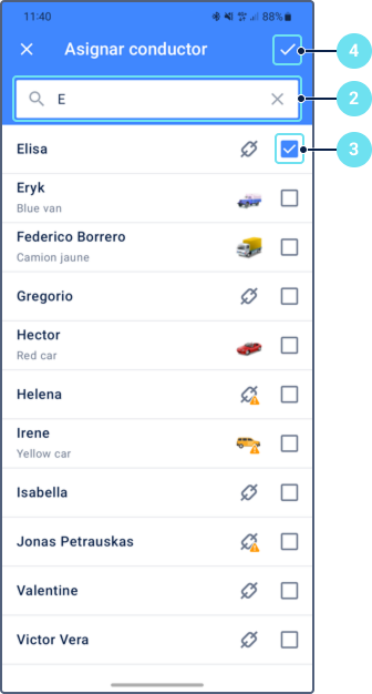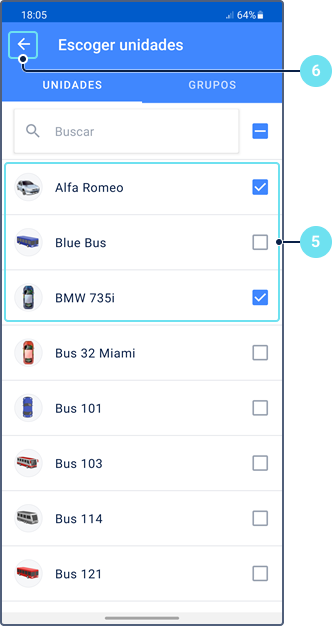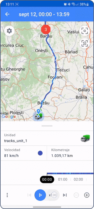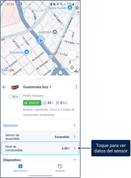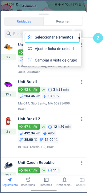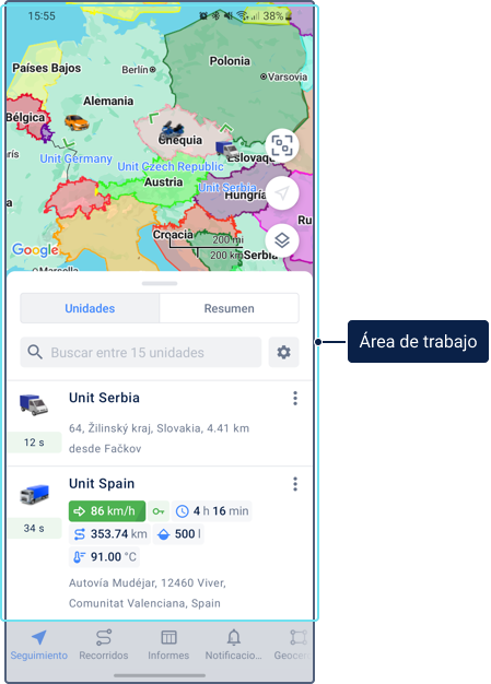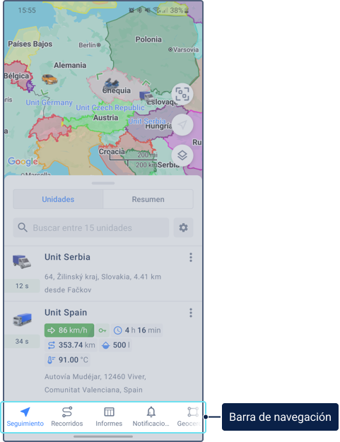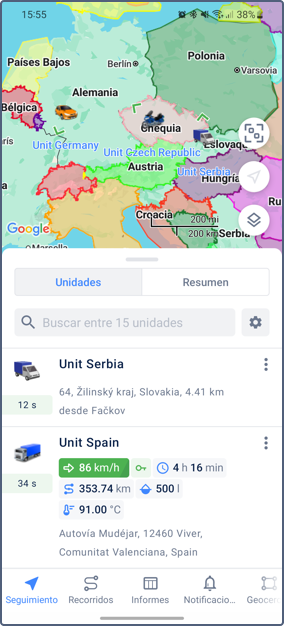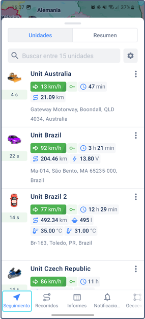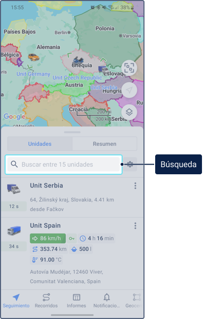 Para ver información sobre una unidad, pulse su icono en el mapa. Pulse el icono nuevamente en la ficha de unidad para centrar el mapa en la unidad y actualizar la información de la unidad.