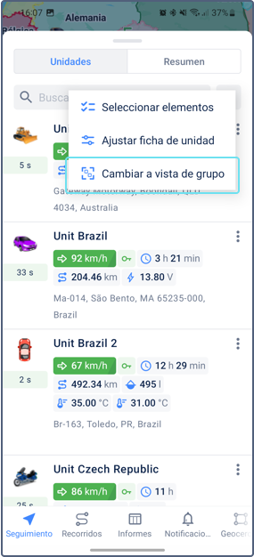 En el modo de vista de grupo de unidades, puede ver los nombres de los grupos y el número de unidades que pertenecen a ellos. Pulse la línea con el nombre del grupo para ver la lista de unidades. También puede acceder al menú para realizar acciones con el grupo de unidades.