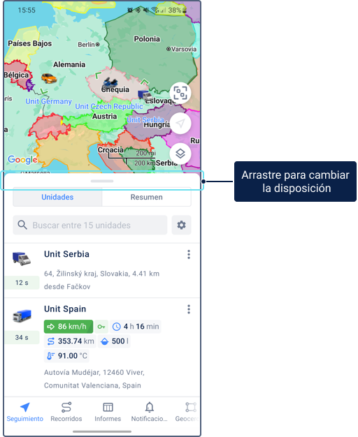 Puede ajustar el diseño de la pestaña Seguimiento. Amplíe la información de la unidad o el mapa arrastrando la sección de información hacia arriba o hacia abajo.