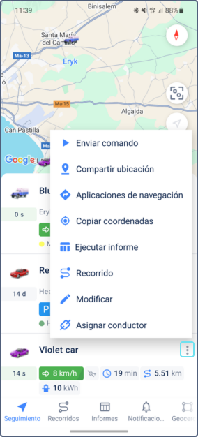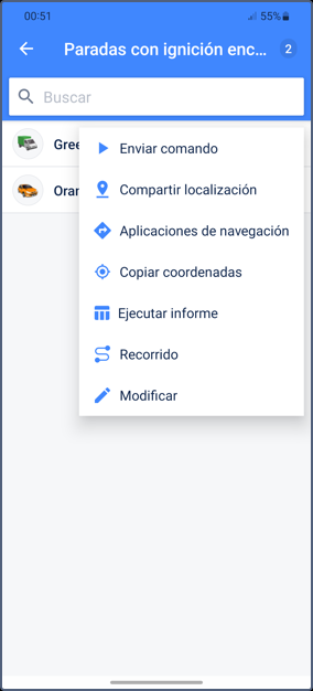 - Menú de unidad: Menú disponible desde la lista de trabajo y las pestañas Información e Historia de la unidad. Permite enviar comandos, compartir ubicación, generar informes y recorridos, y más. Para más detalles, consulte Acciones con unidades desde el menú de unidad.