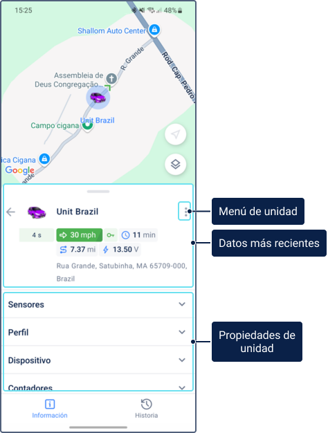 - Información de unidad: Además de la ubicación de la unidad y los datos más recientes, muestra los campos personalizados, propiedades del perfil, tipo de dispositivo, valores de sensores, contadores y parámetros, y más. Para más detalles, consulte Información detallada de unidades.