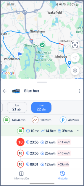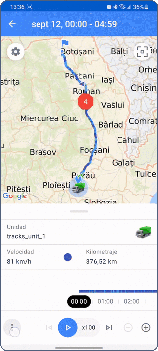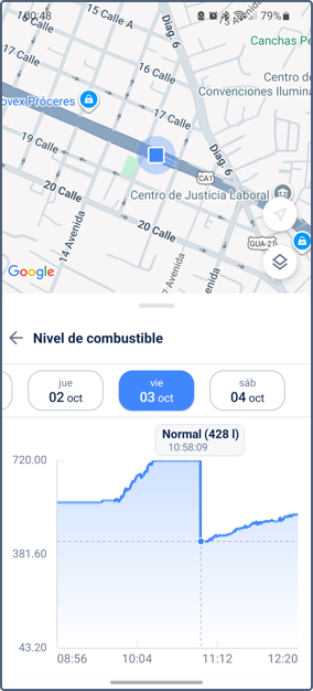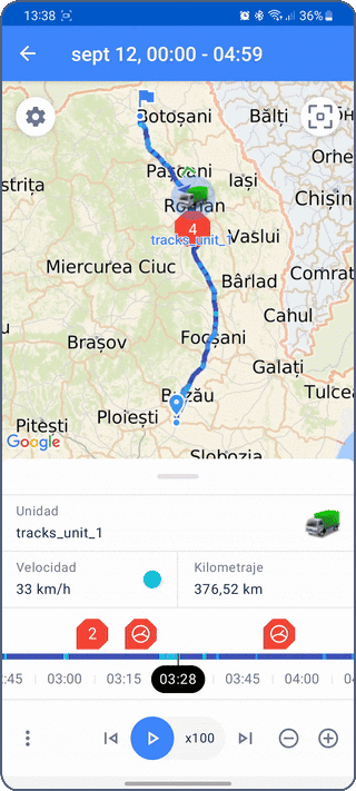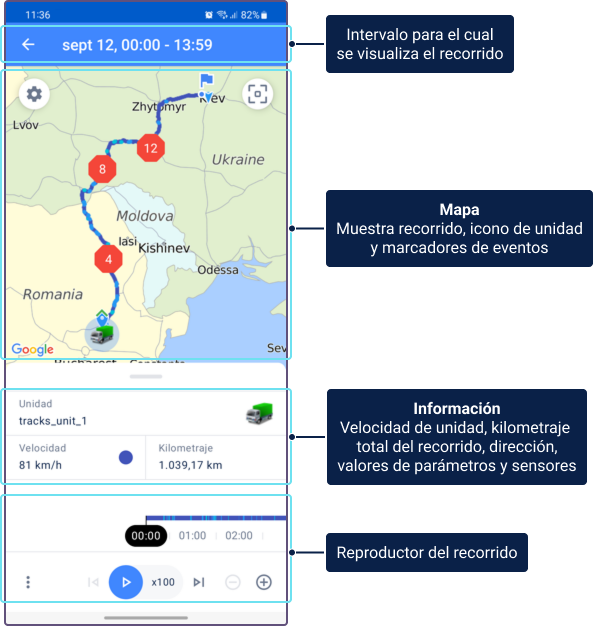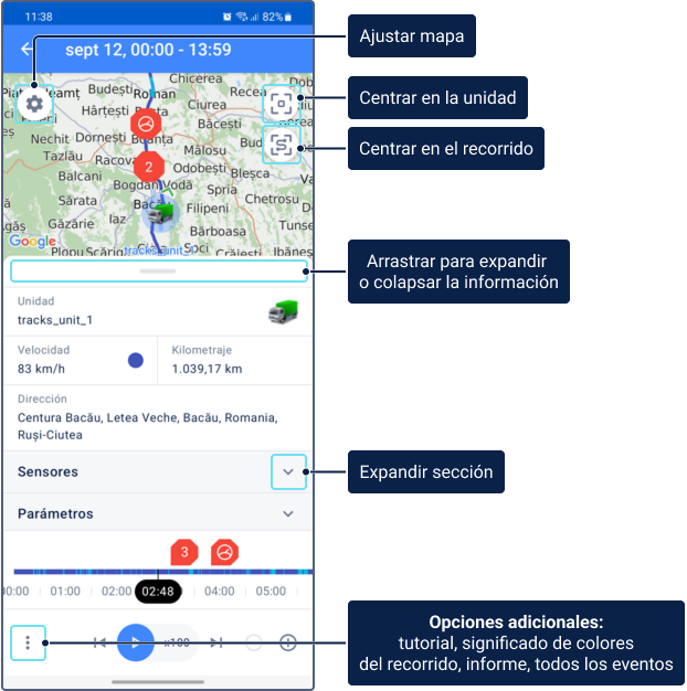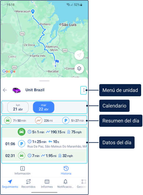 - Historia de unidad: Además de la ubicación de la unidad, proporciona datos históricos, incluyendo viajes, intervalos de estacionamiento, llenados, drenajes y consumo de combustible y eventos registrados. Para más detalles, consulte Historia de unidad.
