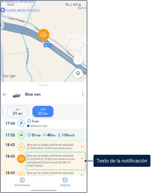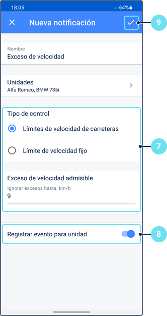 Límite de velocidad. Determinado por los límites de la carretera o un valor personalizado según los ajustes en la pestaña Avanzadas de la versión web.