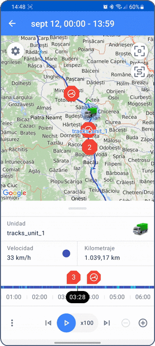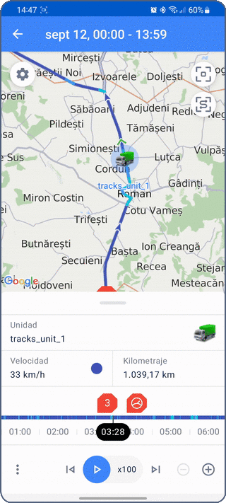 En el modo de vista de unidad, puede ver fichas de unidades individuales. Estas contienen los datos más recientes y un menú para realizar acciones con la unidad: enviar un comando, compartir ubicación, generar un informe o un recorrido, y más.