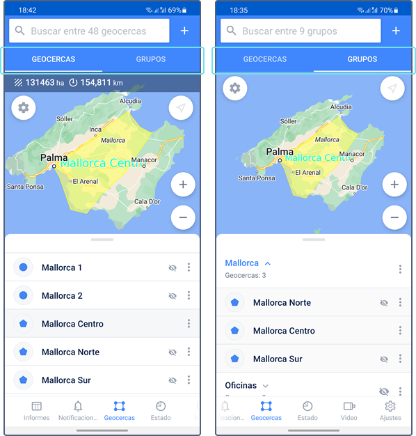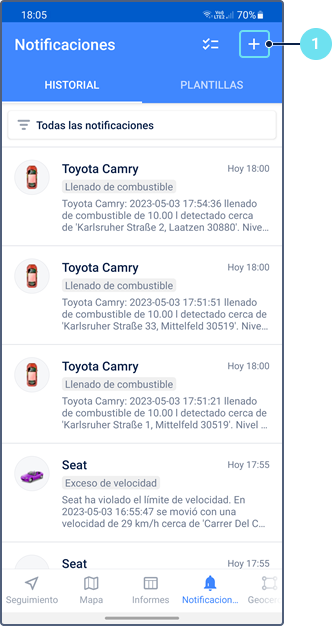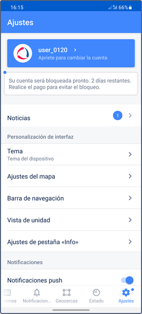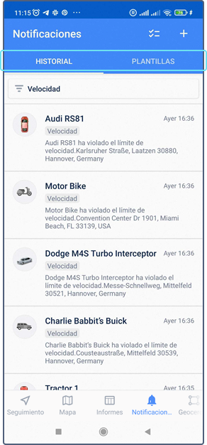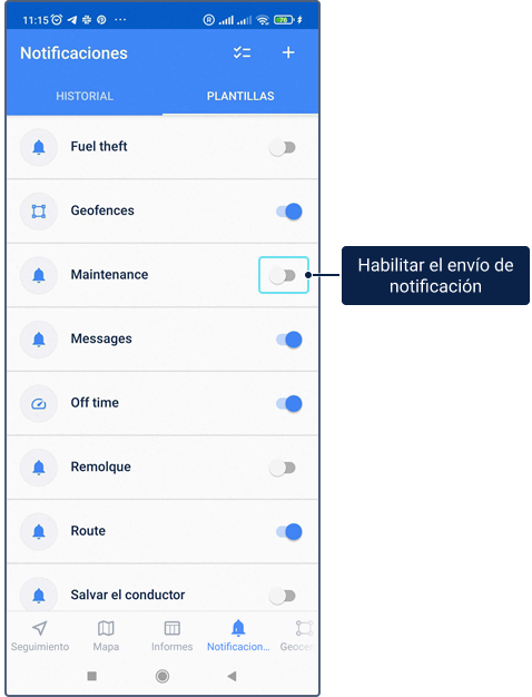 Las pestañas Informes, Notificaciones y Geocercas se muestran si para los servicios Informes, Notificaciones y Geocercas están activados para la cuenta respectivamente.