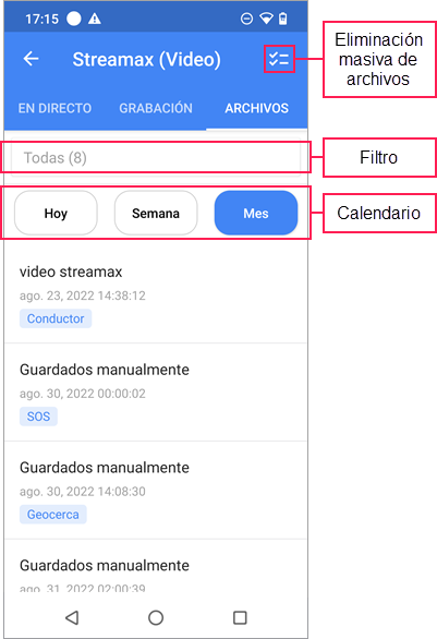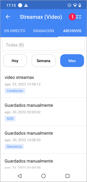 En las pestañas Seguimiento, Video y Geocercas, así como en la sección Plantillas de la pestaña Informes, hay una búsqueda dinámica. Funciona por el nombre del elemento.