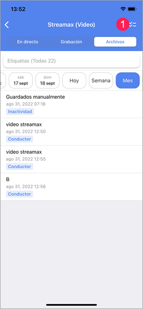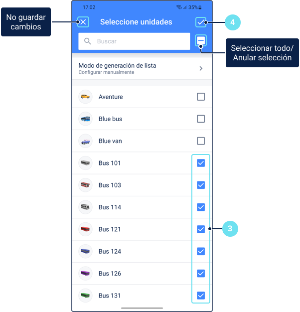 Sincronizar con la versión web Se muestran las mismas unidades y grupos que en la lista de trabajo en la pestaña Seguimiento de la versión web. Si la opción está activada, no se puede modificar la lista manualmente. Configurar manualmente Usted mismo añade unidades que deben mostrarse en la lista. - Pulse el icono para guardar los cambios.