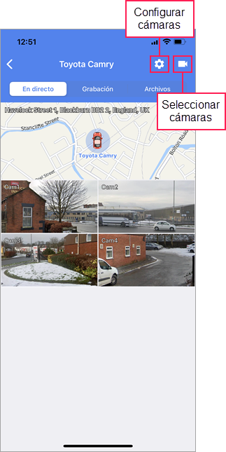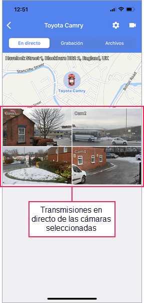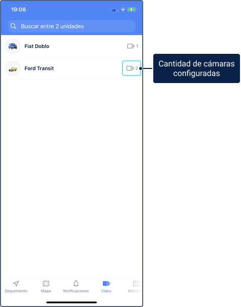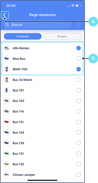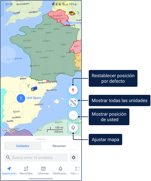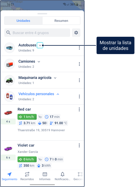 Para ver información sobre una unidad, pulse su icono en el mapa. Pulse el icono nuevamente en la ficha de unidad para centrar el mapa en la unidad y actualizar la información de la unidad.