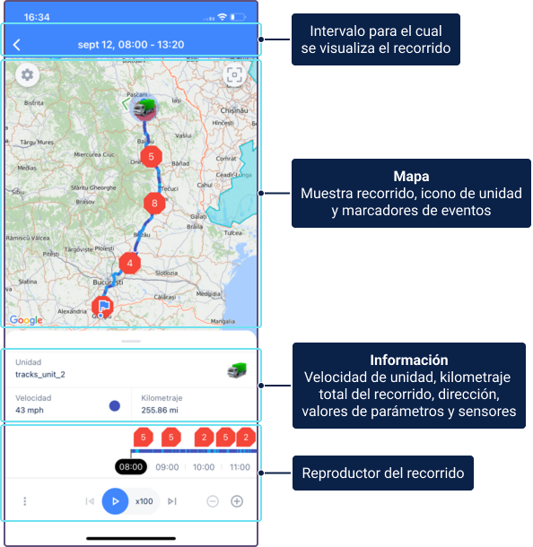 - Historia de unidad: Además de la ubicación de la unidad, proporciona datos históricos, incluyendo viajes, intervalos de estacionamiento, llenados, drenajes y consumo de combustible y eventos registrados. Para más detalles, consulte Historia de unidad.