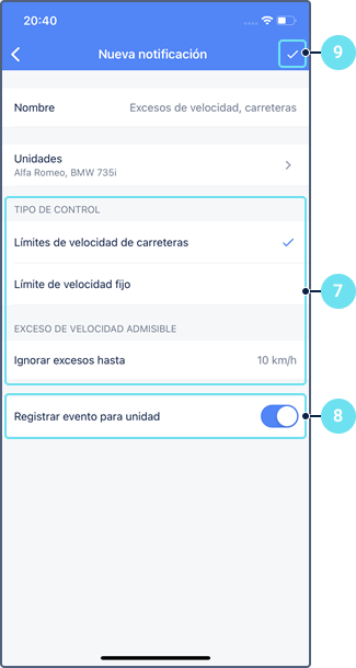 Límite de velocidad. Determinado por los límites de la carretera o un valor personalizado según los ajustes en la pestaña Avanzadas de la versión web.