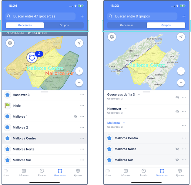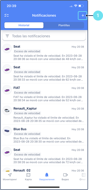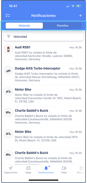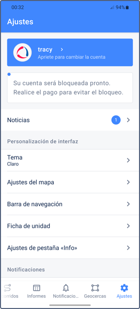 Las pestañas Informes, Notificaciones y Geocercas se muestran si para los servicios Informes, Notificaciones y Geocercas están activados para la cuenta respectivamente.